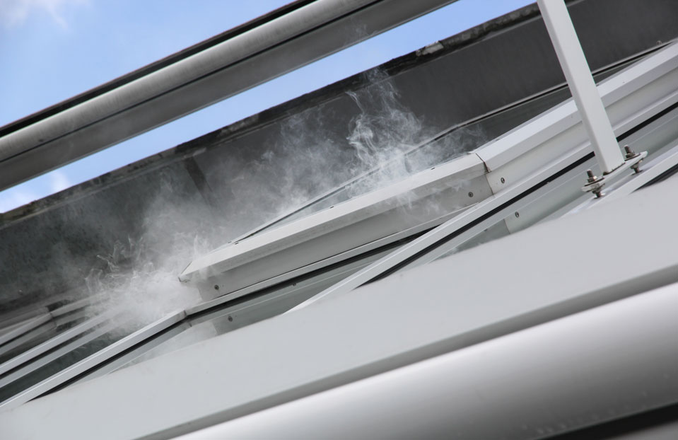 Nicht hinzunehmende Zuglufter-scheinungen auf der Raumseite von Aluminium-Dachfenstern. Der Versuch mit Kunstnebel (ohne künstlich angelegten Differenzdruck) zeigt starke Nebeldurchtritte von innen nach außen.