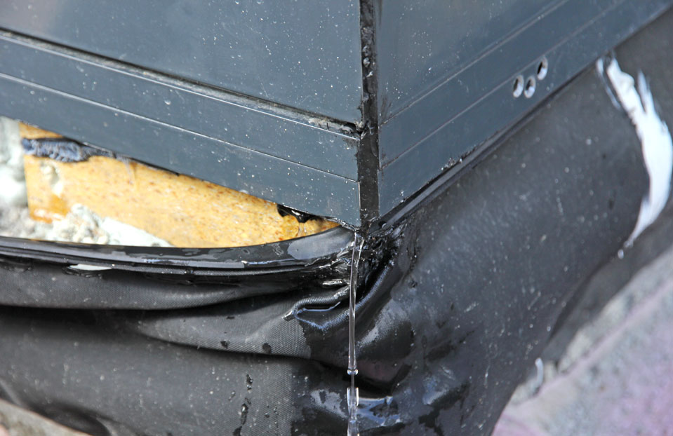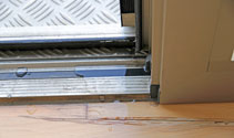 Undichtigkeit an 90°-Ecken von Schiebetüranlagen. Beschädigung des Bauanschluss-Bereichs durch Einleitung von Wasser aus den Falzräumen der Sockelprofile.