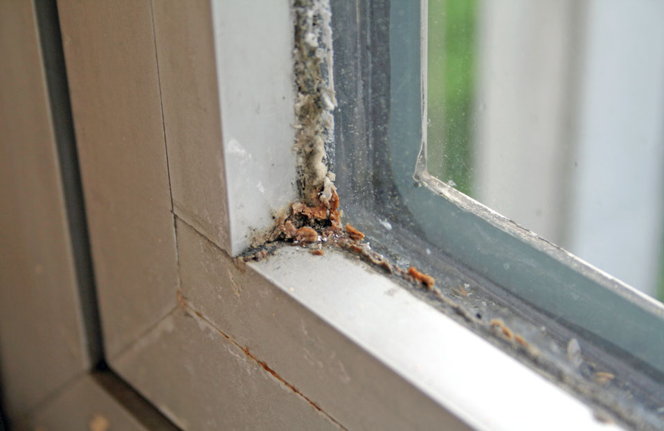 Wasserdurchtritt im Flügelrahmen vom Falzraum in die Gehrungsecken. Beschädigung der Dichtigkeit und der Tragfähigkeit der Eckverbindungen.