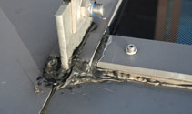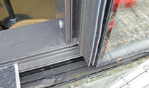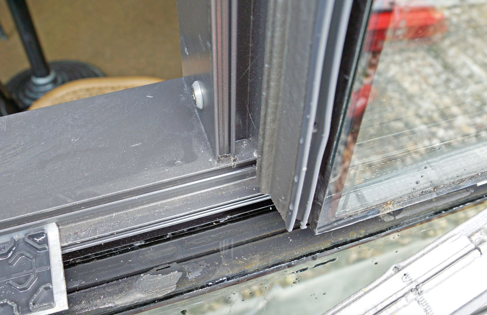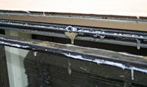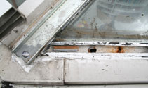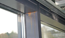 Nach einer Standzeit von drei Jahren sind die Falzräume der Pfosten- und Riegelprofile mit transparentem Schlick gefüllt. Die Randverbunde der Isoliergläser sind beschädigt.