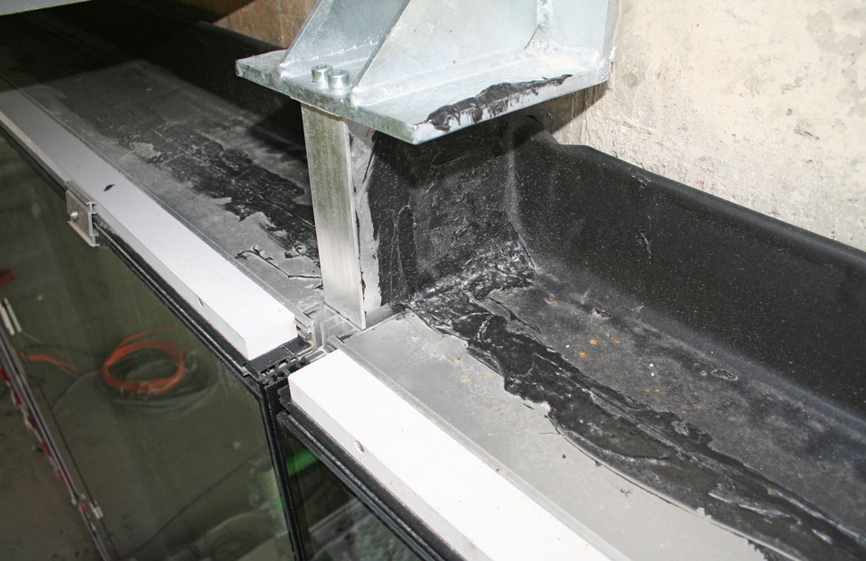 Die ausgeführte Konstruktion ist hindichtlich der Abdichtung nicht funktionstauglich. Die Bauwerks-abdichtung wurde nicht hochgezogen und an den Fußpunkt der Pfosten-Riegel-Fassade angeschlossen. Zudem wurde nicht konstruktiv verhindert, dass Wasser aus der Pfosten-Riegel-Konstruktion in das Wärmedämm-verbundsystem hinein gelangen kann.