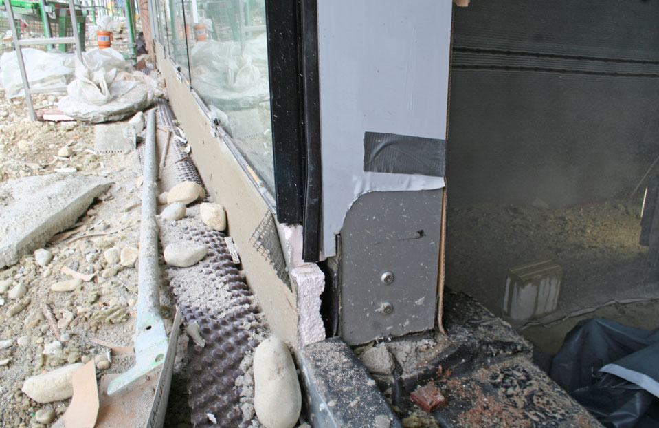 Wassereinleitung von der Pfosten-Riegel-Konstruktion in das anschließende WDVS (Wärmedämmverbundsystem).