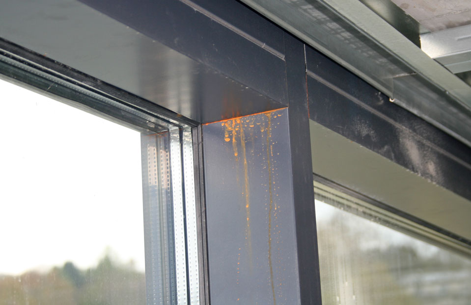 Die Pfosten- und Riegel-Stahltragprofile wurden nicht verzinkt und nur auf der Außenseite organisch beschichtet. Die ungeschützten Bereiche der Stahltragprofile (Innenseiten und Schnittkanten) korrodieren an der Raumluft.