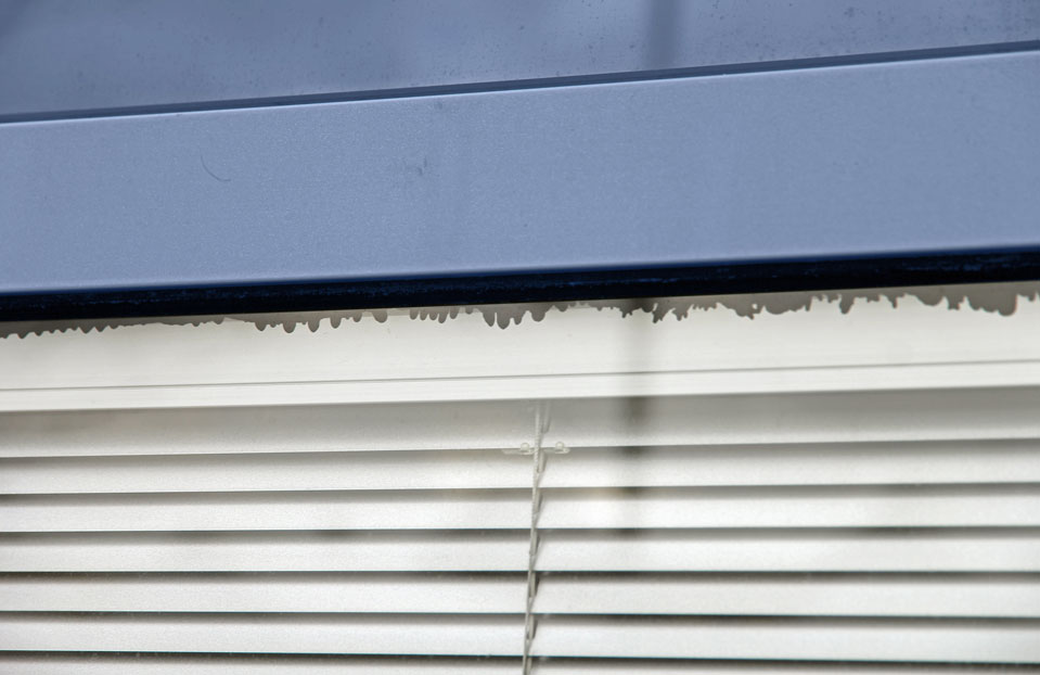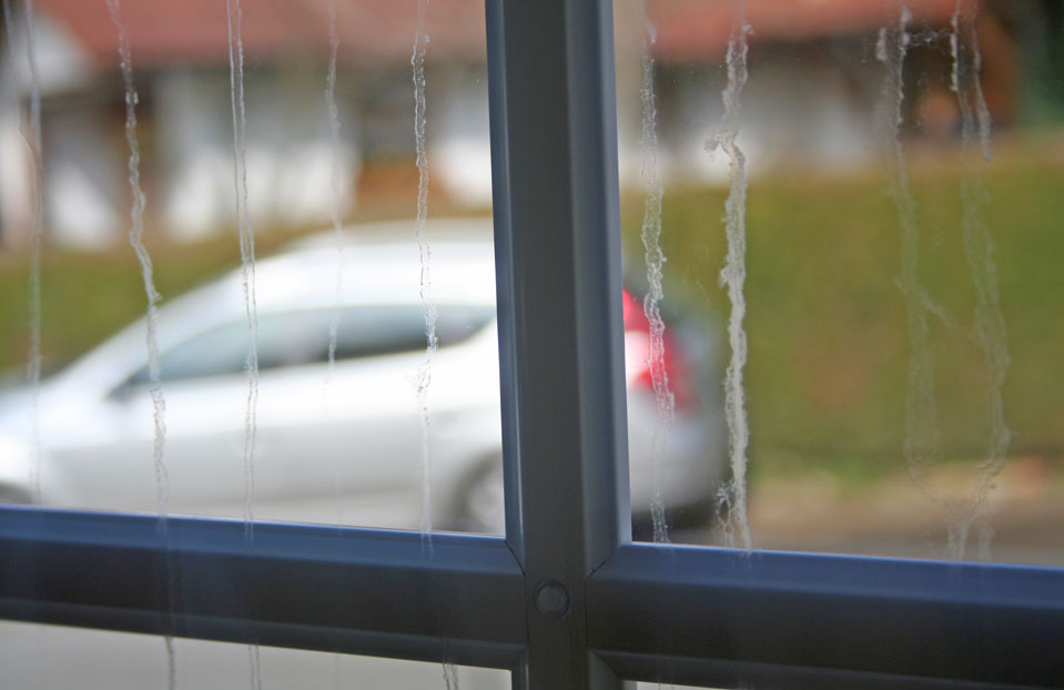 Kondensat und Wasserablaufspuren im Scheibenzwischenraum von 25 Jahre alten Zweifach-Isoliergläsern.