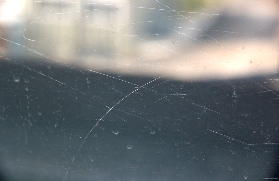 Zur Beseitigung von Mörtelspritzern wurden die Glasoberflächen mit einem Glashobel gereinigt. Die Kratzspuren wurden durch das Reiben von Sandkörnchen und durch Ritzen mit den Enden der Glashobel-Klinge verursacht. Aufgrund der Druckspannungszone in der Glasoberfläche entstehen bei vorgespannten Gläsern stärkere Kratzer.