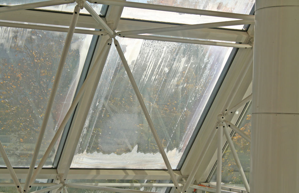 Isoliergläser in Lichtdächern sind durch die geneigte Einbaulage einer erhöhten Belastung ausgesetzt. Aufgrund der undicht gewordenen Randverbunde ist die Lebensdauer der Isoliergläser abgelaufen.